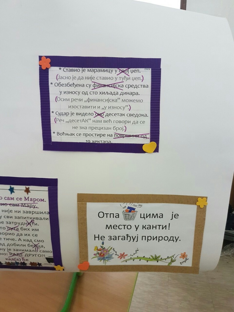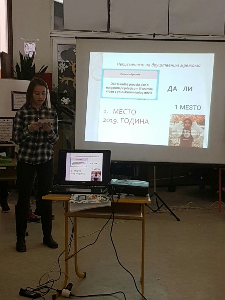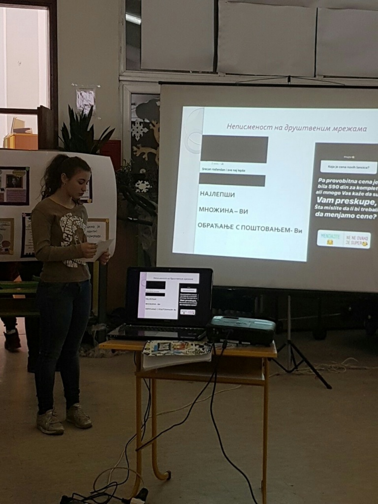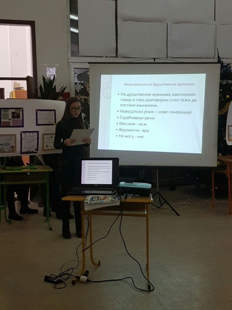 Ученици осмог разреда наше школе заједно са наставницом српског језика Александром Љубојевић оджали су јавни час на тему „Неписменост на интернету“. Часу су присуствовали сви ученици и наставници школе. Идеју за овакав пројекат ученици су пронашли у многобројним грешкама које свакодневно срећемо у препискама и објавама на интернету. Припремили су презентацију и два паноа са примерима како се треба правилно изражавати и писати.