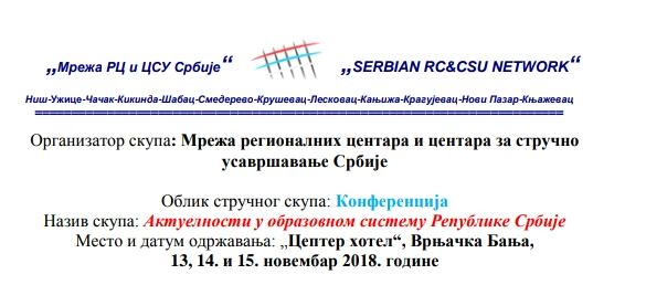 Након успешно реализованог стручног скупа Министарства просвете Србије, Центар за стручно усавршавање Кикинда у сарадњи са Мрежом регионалних центара Србије организовао је Трећу конференцију мреже РЦ и ЦСУ Србије под називом „АКТУЕЛНОСТИ У ОБРАЗОВНОМ СИСТЕМУ РЕПУБЛИКЕ СРБИЈЕ“. Конференција је одржана у периоду од 13. до 15. новембра 2018. године у Врњачкој Бањи.